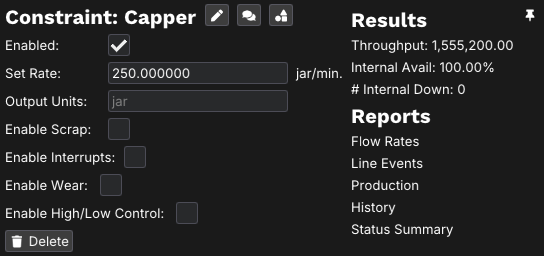 Next let's look at our jar filler. from the video, we know it can fill up to 250 jars per minute. doing a quick search, the most common size for a jar of peanut butter is 16.3 oz. When we left click on converter 0 in the example above, we can fill in the information as shown to reflect our example. Clicking the pencil icon besides the converter name allows us to rename it to "Jar Filler"