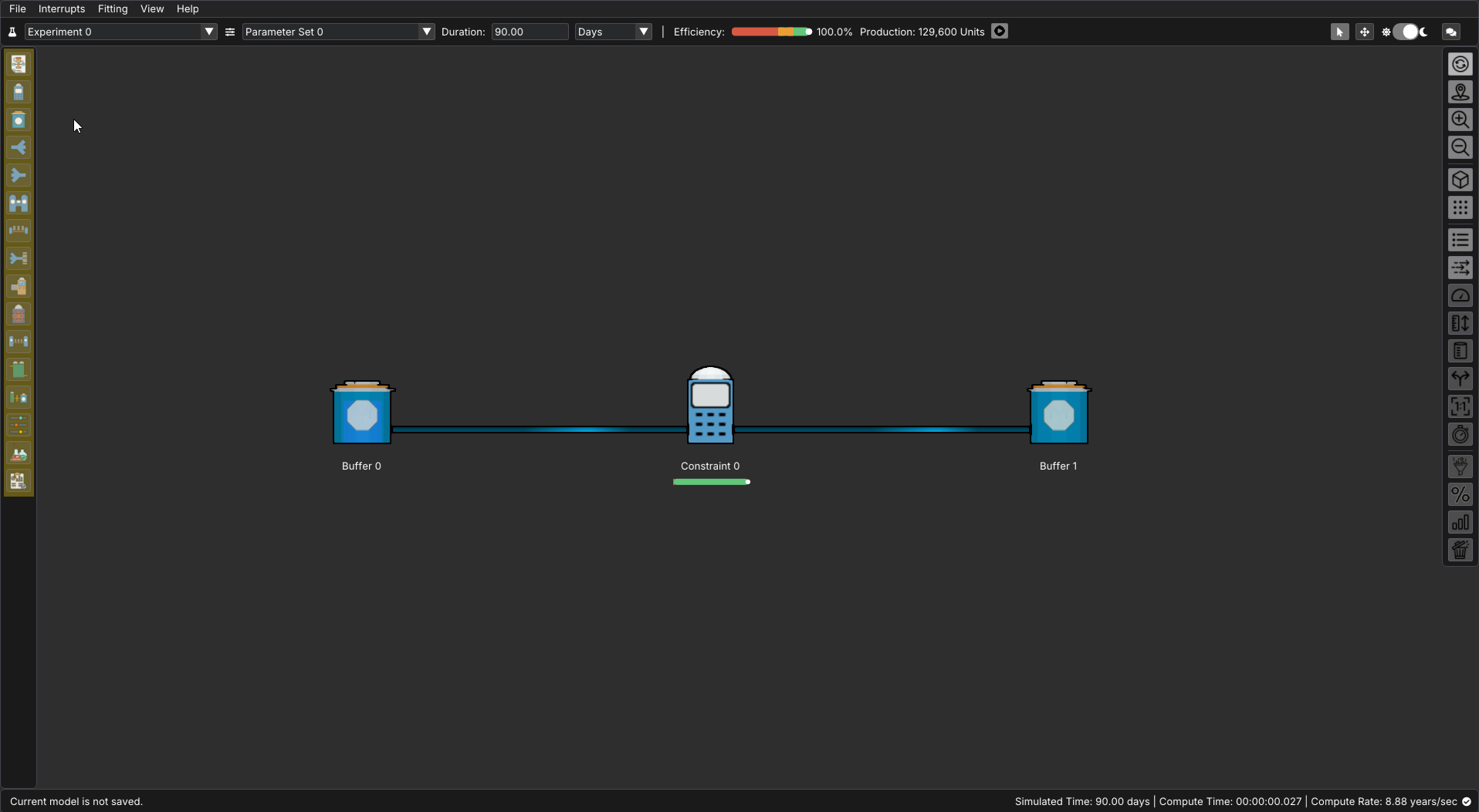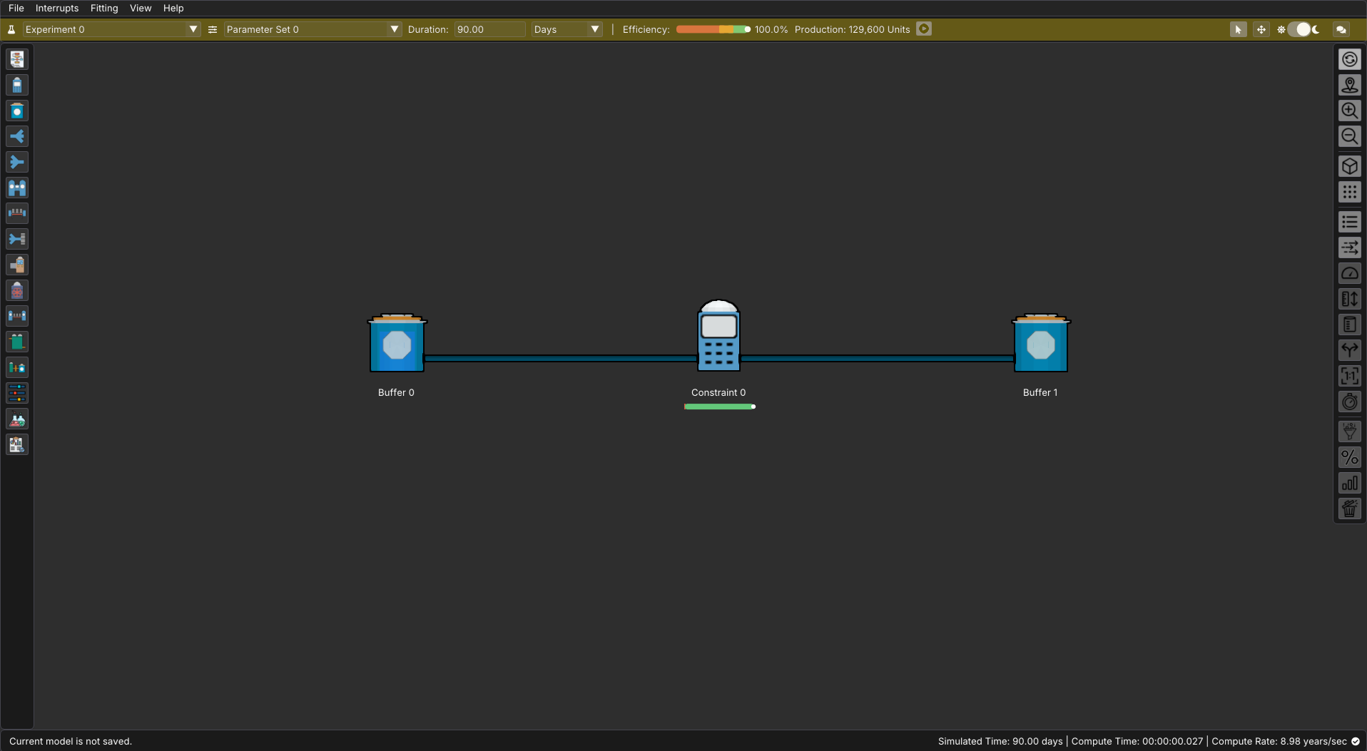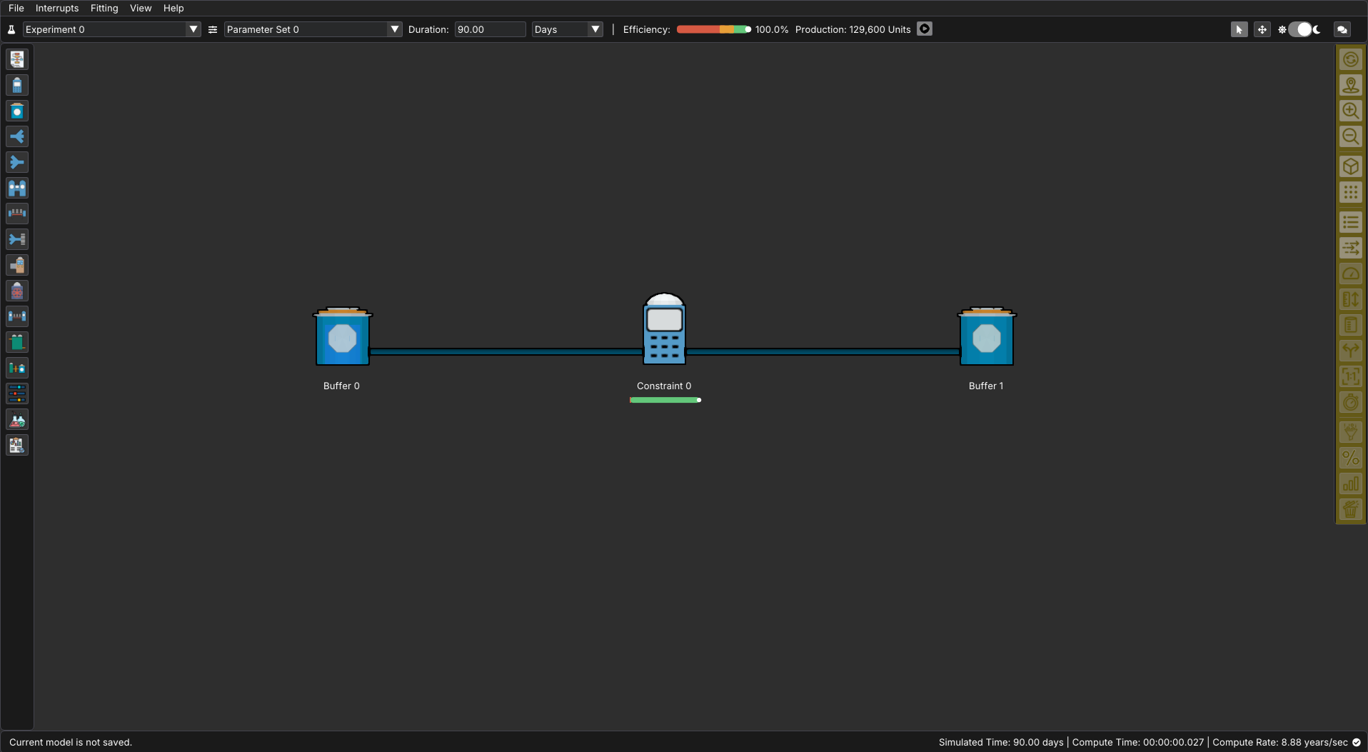 When ReliaSim opens a new file, it starts you with a simple, valid flow: Buffer → Constraint → Buffer. Think of this as a clean baseline rather than a finished model. The first buffer represents an unlimited source of material entering your system, while the final buffer represents everything that leaves the process. Keeping these two buffers intact gives your model a clear beginning and end, which makes results like throughput, efficiency, and flow behavior easier to interpret as your model grows.